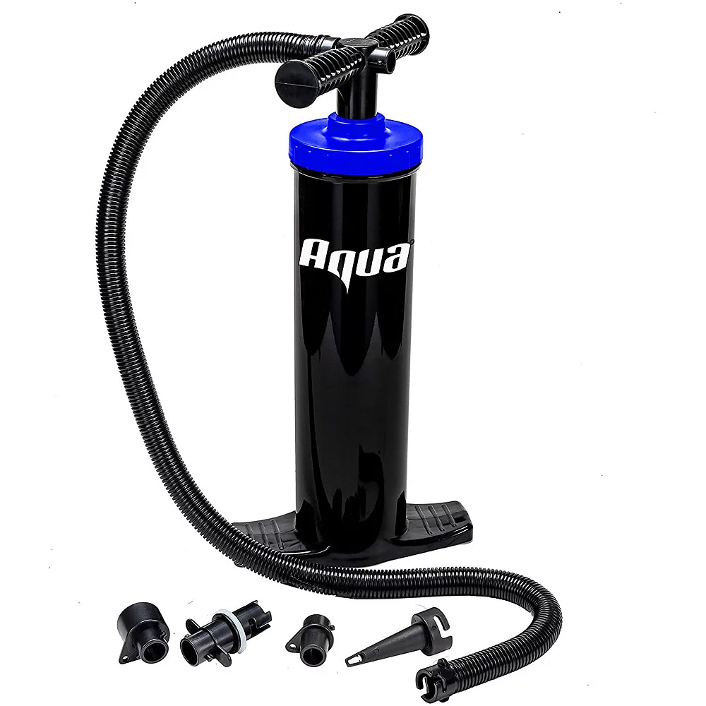 Get into the pool quicker with this hand pump, inflating high-pressured inflatables up to 35 psi. Built with a dual-action pump design, this device pumps air on both up and down stroke, maximizing effort and airflow. The pump set includes a pump, hose, and 4 universal adapters to use with your inflatables. A stable and secure base with wide handle makes the pump easy to use on virtually any surface.