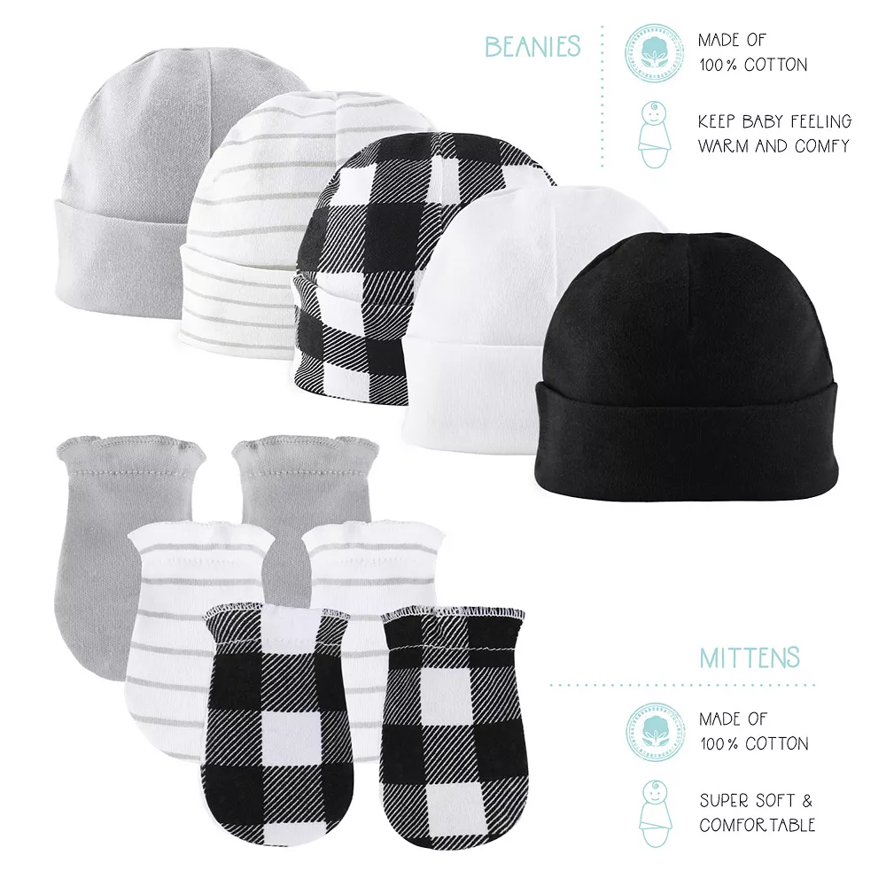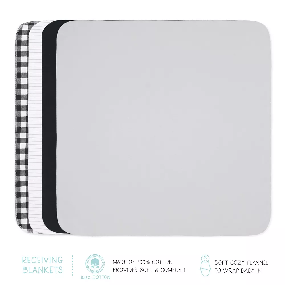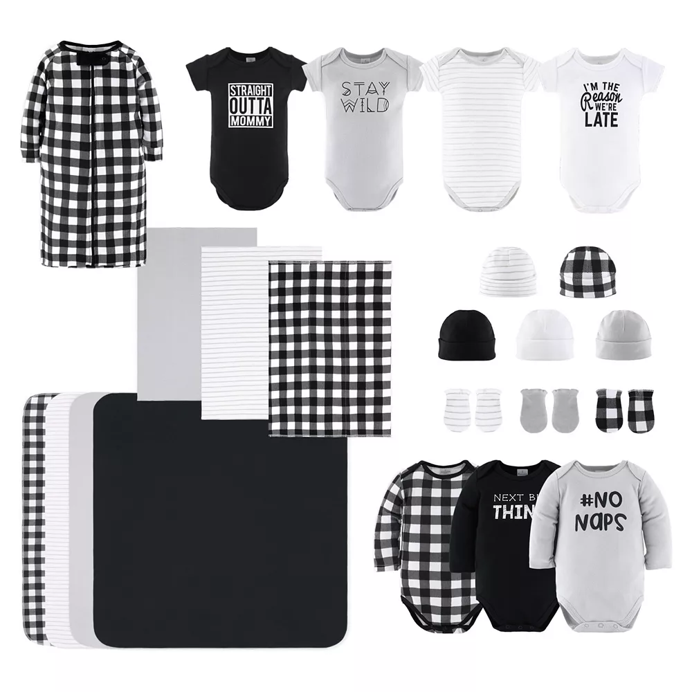 - 23-piece set includes: 4 receiving blankets, 3 burp cloths, 3 mitten sets, 5 hats, 3 long sleeve body suits, 4 short sleeve body suits & 1 sleep bag