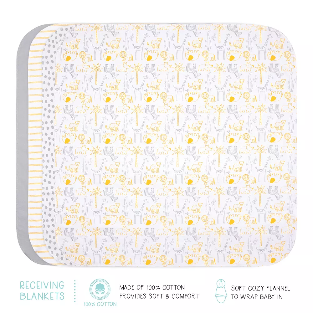 - 23-piece set includes: 4 receiving blankets, 3 burp cloths, 3 mitten sets, 5 hats, 3 long sleeve body suits, 4 short sleeve body suits & 1 sleep bag