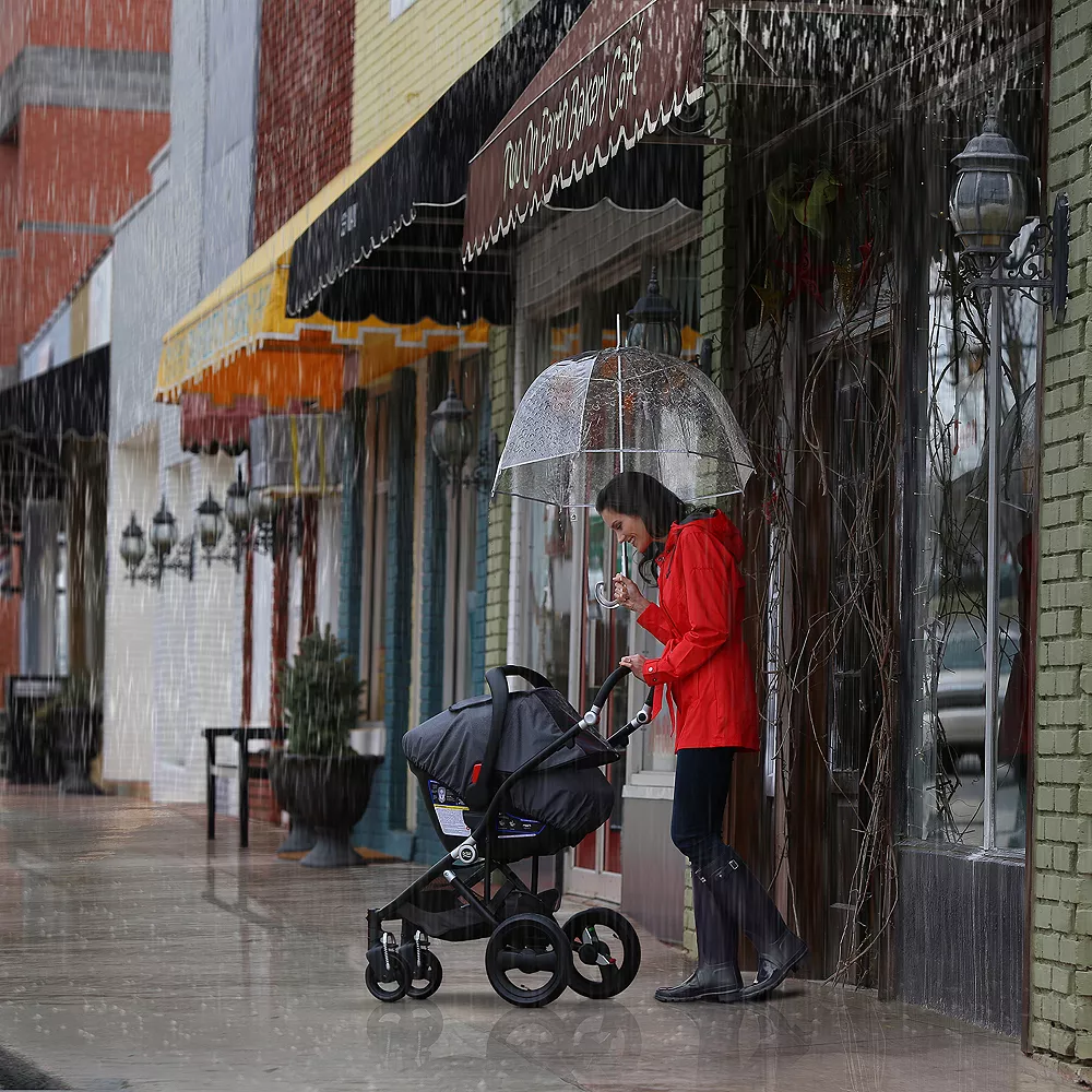 - A clear shield keeps your little one comfortable and dry in rainy or windy conditions