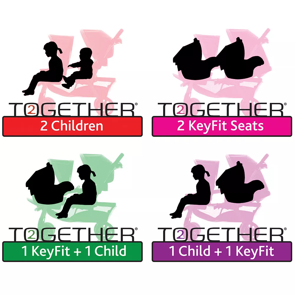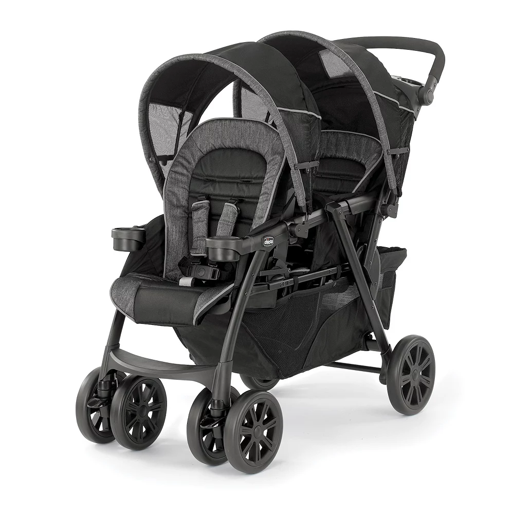 - Two padded stroller seats with independent, adjustable and removable canopies accommodate older children