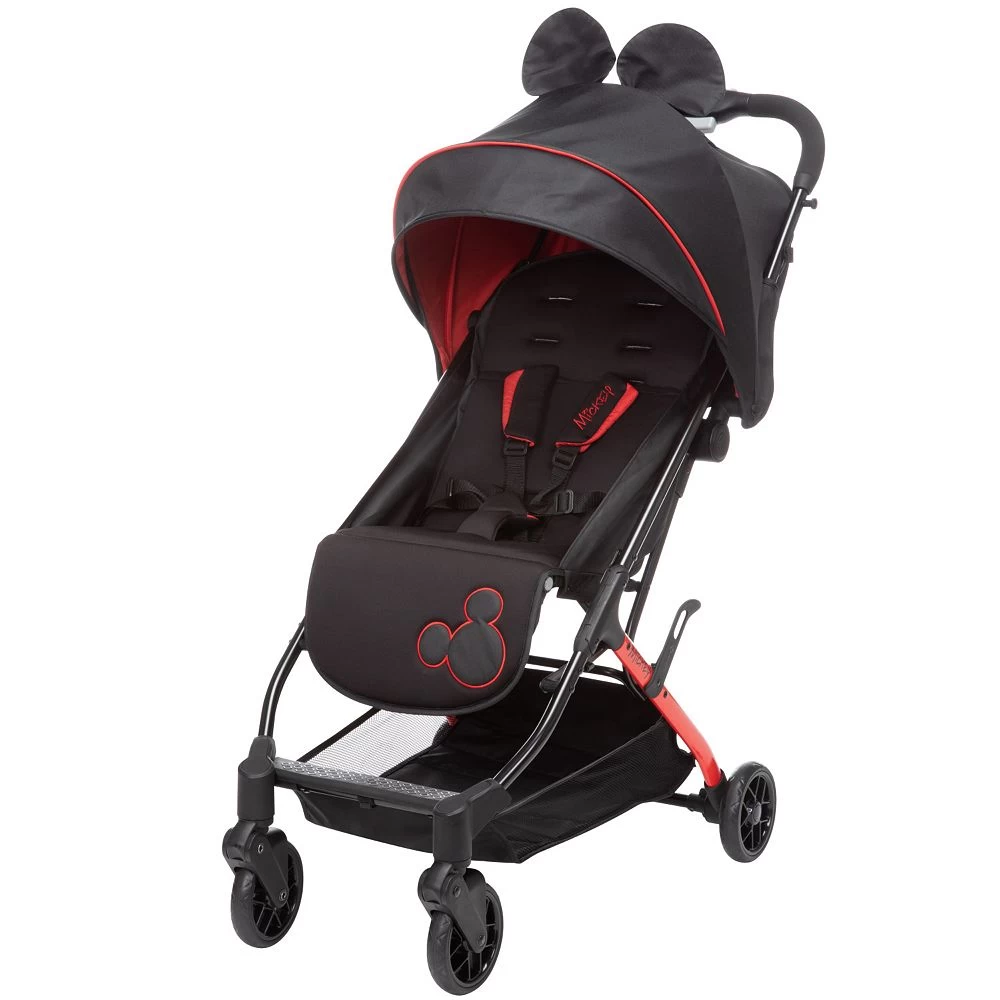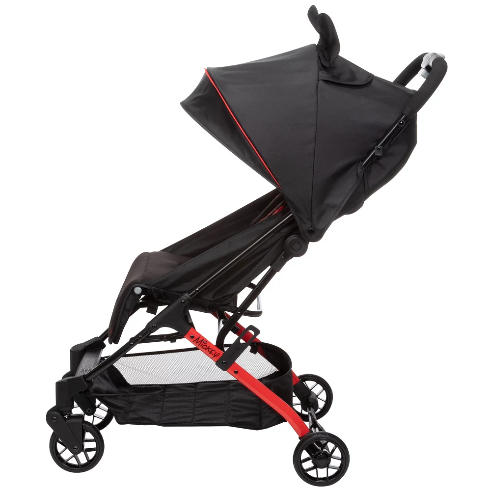 - The extra-large canopy, complete with your favorite Disney ears, lets your child sit comfortably in the shade on sunny days, with a flip-out visor to protect from oncoming glare