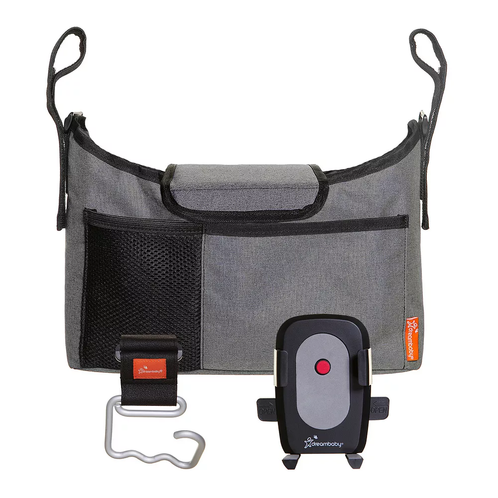 The Stroller Accessory Essentials comes with the Dreambaby Strollerbuddy On-The-Go Bag, two Aluminum Stroller Hooks and a Dreambaby Strollerbuddy EZY-Fit Phone Holder.