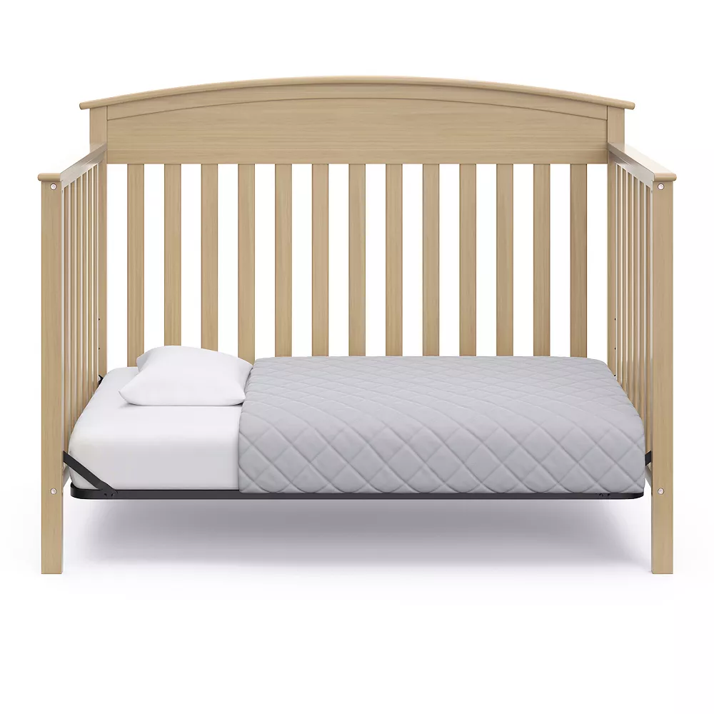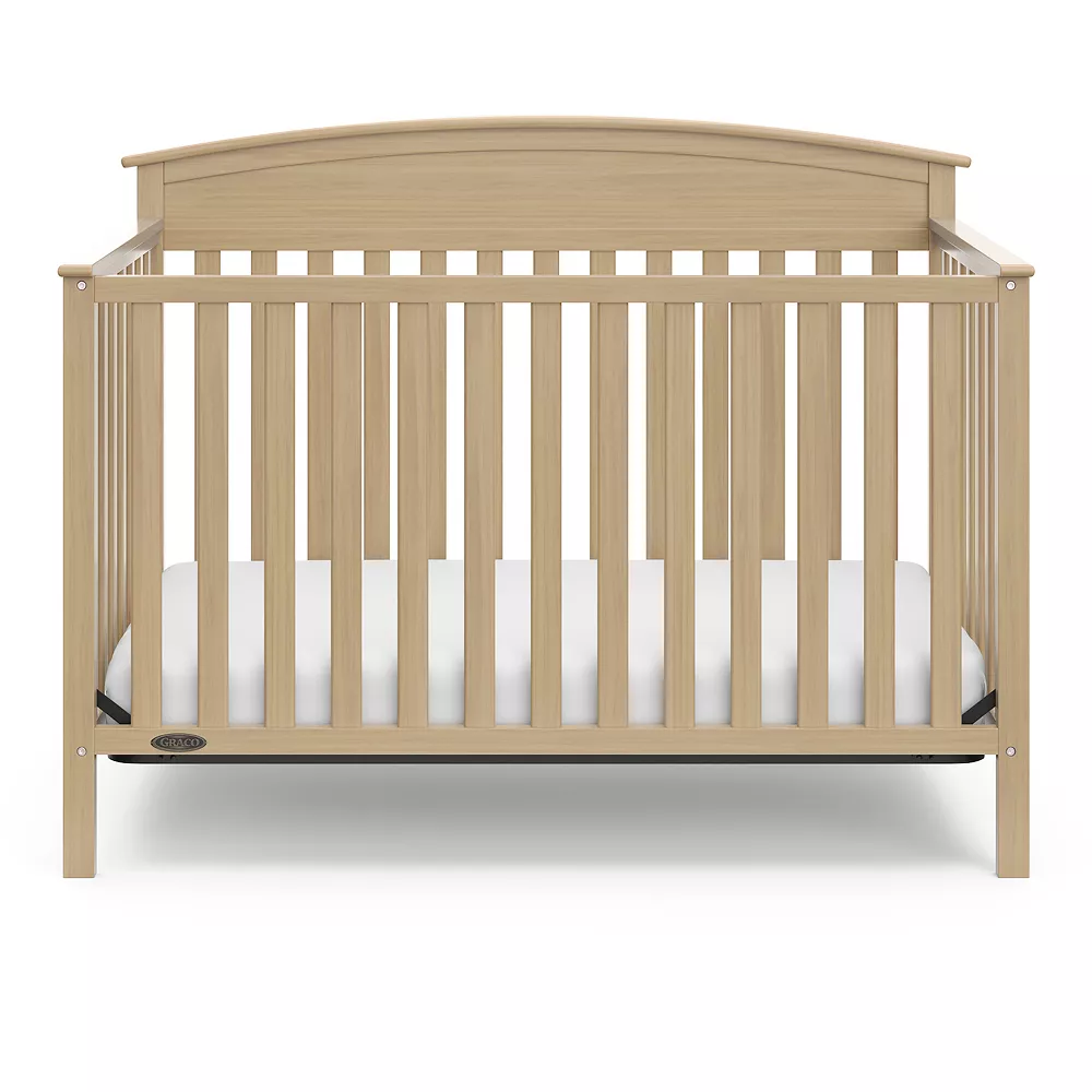 This Graco crib features an arched headboard design, making it a classic nursery piece.