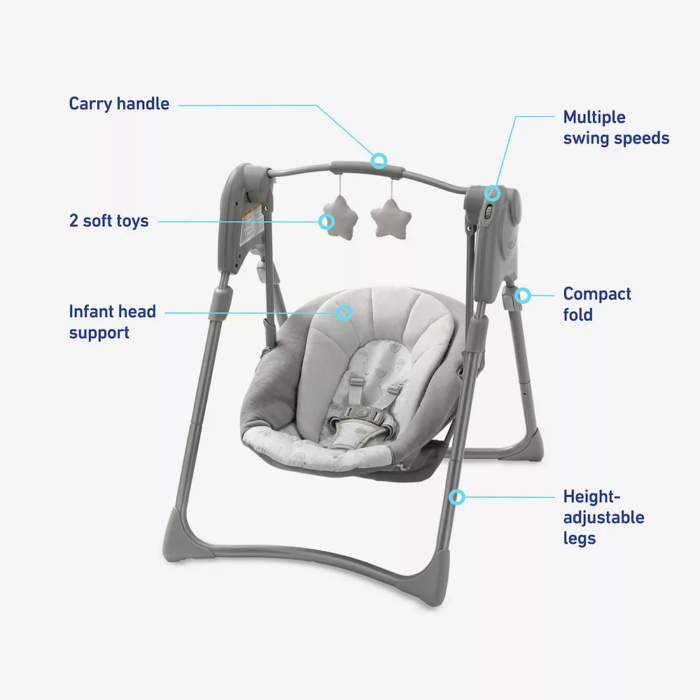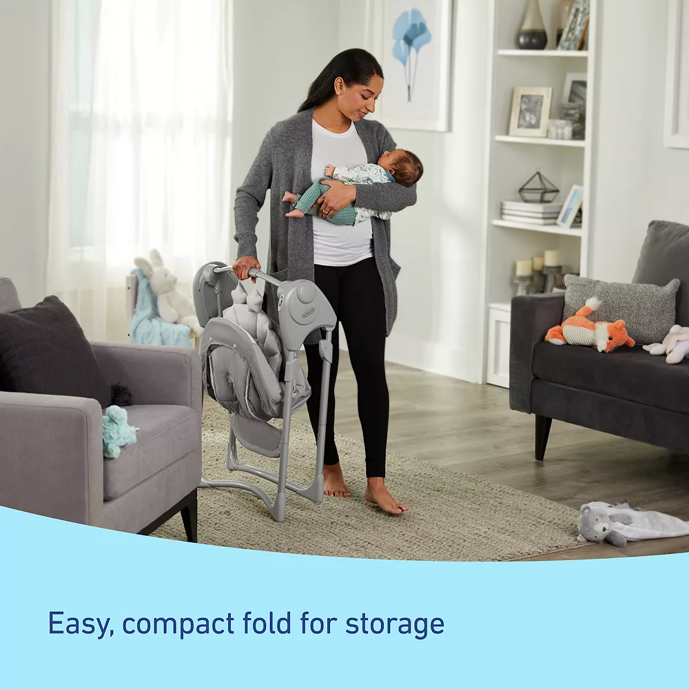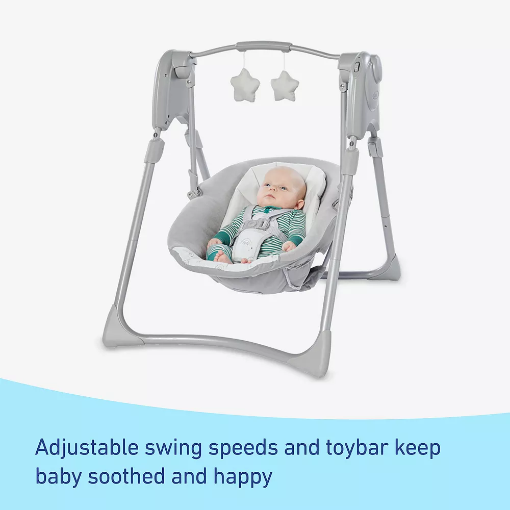 The Graco Slim Spaces Compact Baby Swing allows you to experience the space-saving benefits of a compact baby swing without sacrificing the easy interaction with baby that you find with a full-size swing.