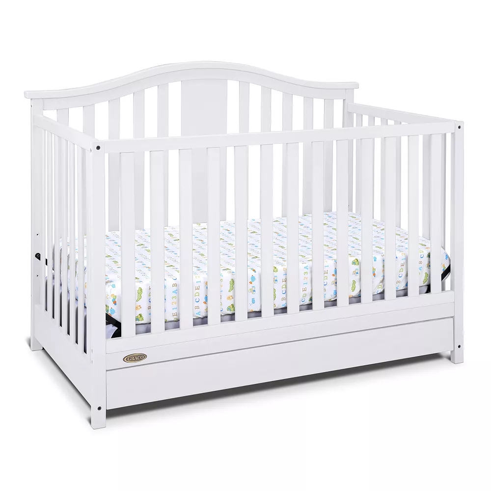 Complete with a large pull-out drawer, this Graco convertible crib features ample storage for extra crib sheets, blankets or bibs.