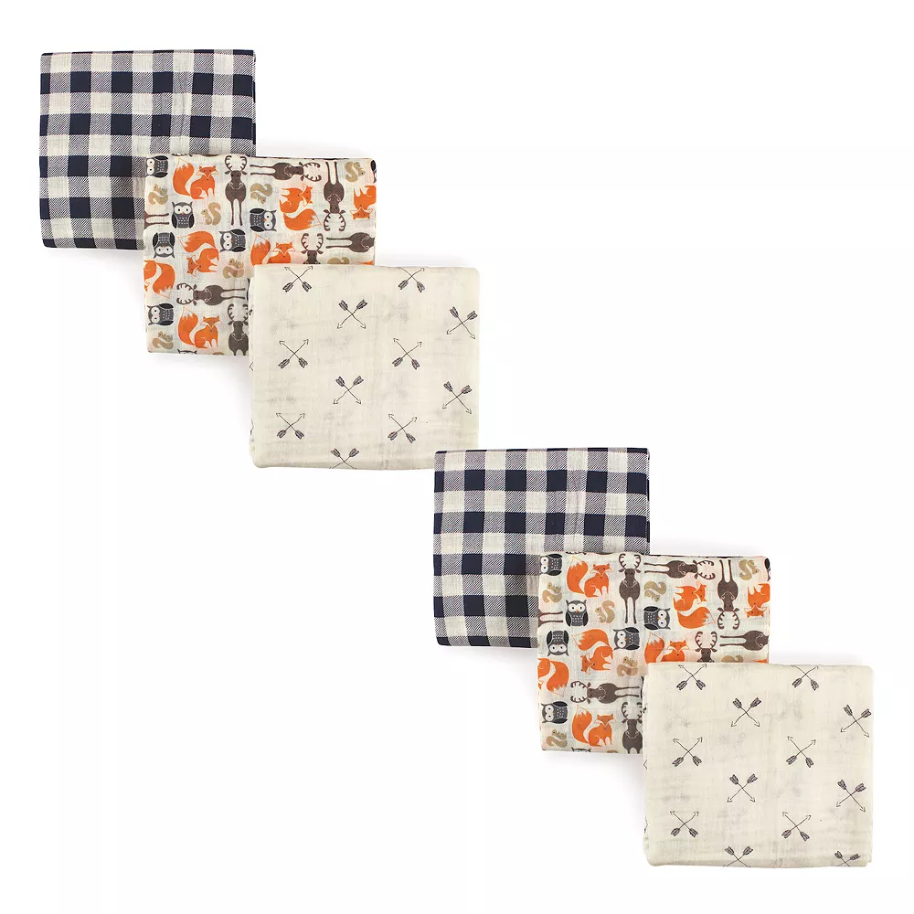 - Set of coordinating muslin swaddle blankets. Measures 46×46 inches.