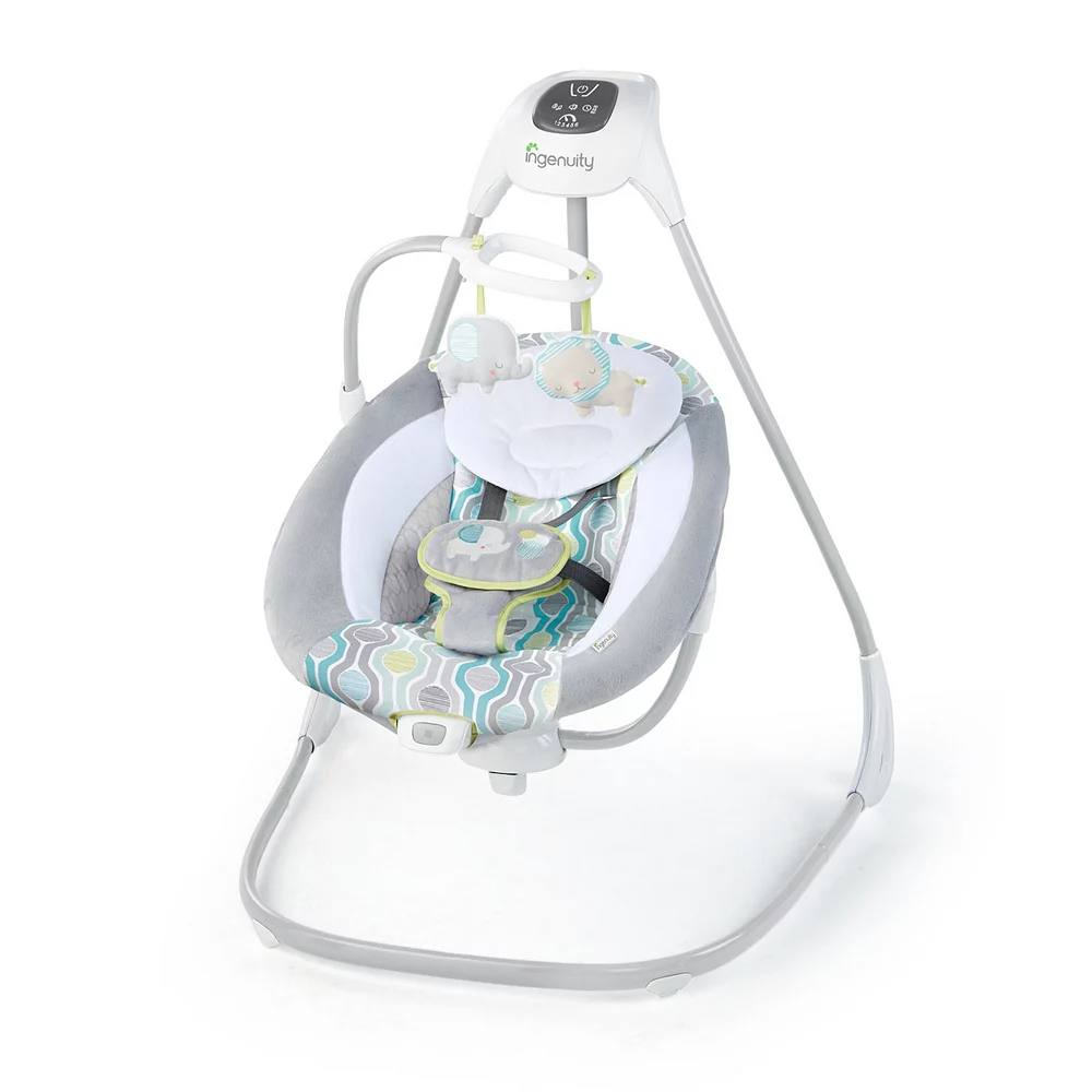 Keep your little one happy and comfortable in the Ingenuity Simple Comfort Baby Electric Soothing Swing Swivel Rocker while you take a break from cradling them in your arms. This baby swing chair provides plenty of soothing comforts to ensure your infant won’t get fussy when you don’t have time to cuddle or coddle. There are 2 position seat reclines designed to either soothe or engage. Features 6 speeds let you adjust the swinging to your baby’s preference while a built-in light helps to keep them entertained. The infant lounger seat swivels 180 degrees in the frame and swings in 3 directions so that you can always keep an eye on your baby. If any mess falls on the seat pad, rest assured that the seat pad and bolster are machine washable for easy cleaning. The frame folds up with ease for you to quickly store this swing. Soothe your baby with 16 melodies while this swing cradles them to sleep. Designed with a 5-point safety harness to ensure that your baby is safe in this swing. Give you and your little one peace of mind with the Ingenuity Simple Comfort Baby Electric Soothing Swing Swivel Rocker.