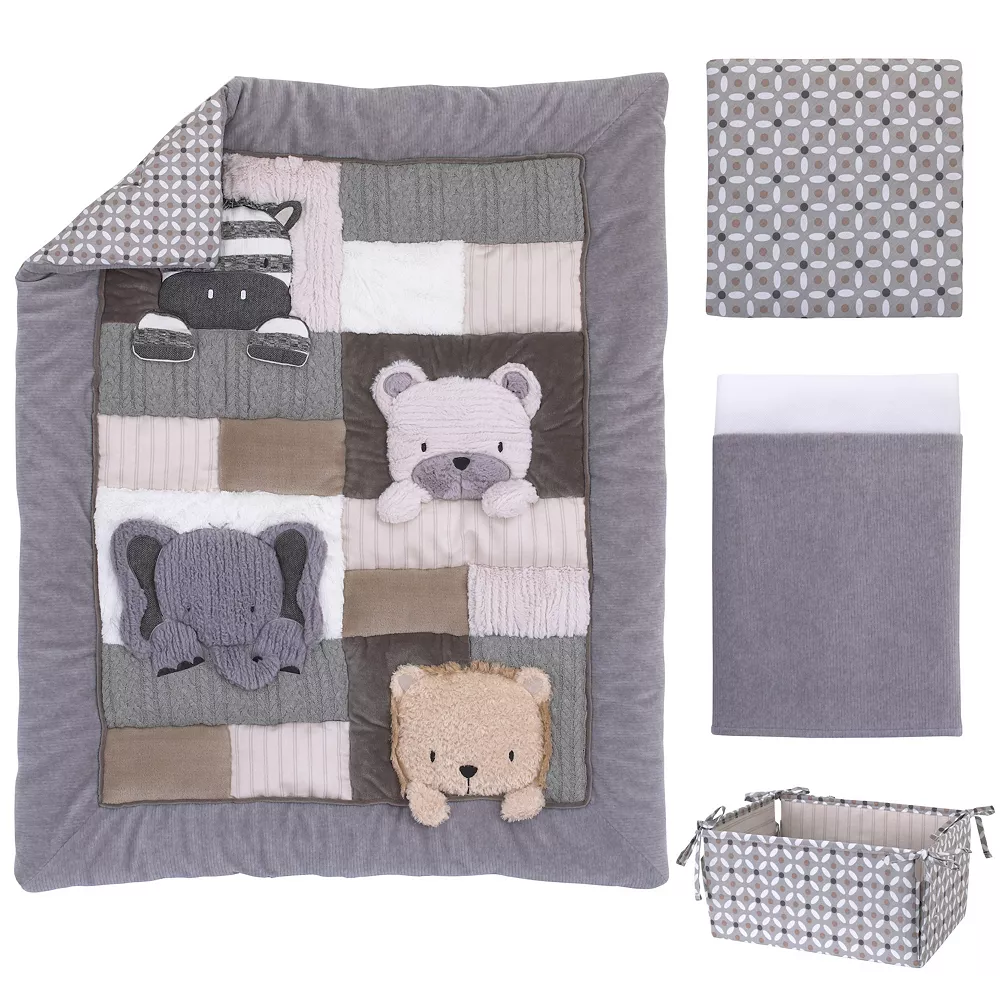 Featuring an elephant, bear, lion and zebra, this NoJo patchwork crib bedding set completes your little one’s nursery with adorable touches.