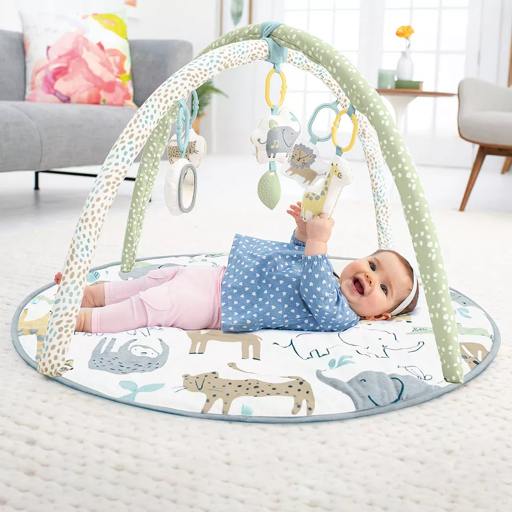 Packed with 20 developmental activities and five hanging toys, engage baby with textures and sounds of the Skip Hop Carters Safari Gym.