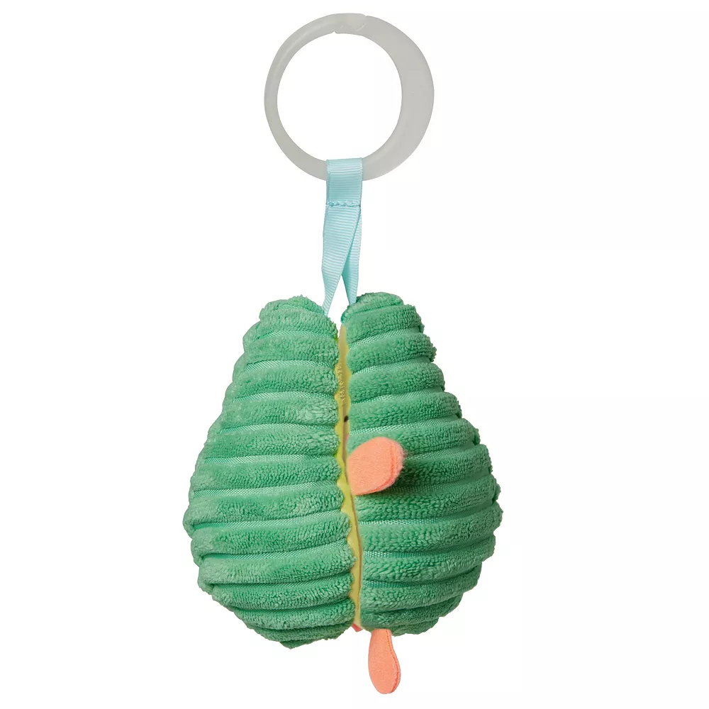 - Avocado-shaped plush toy comes apart in halves with a rattle interior as the avocado “pit.”
