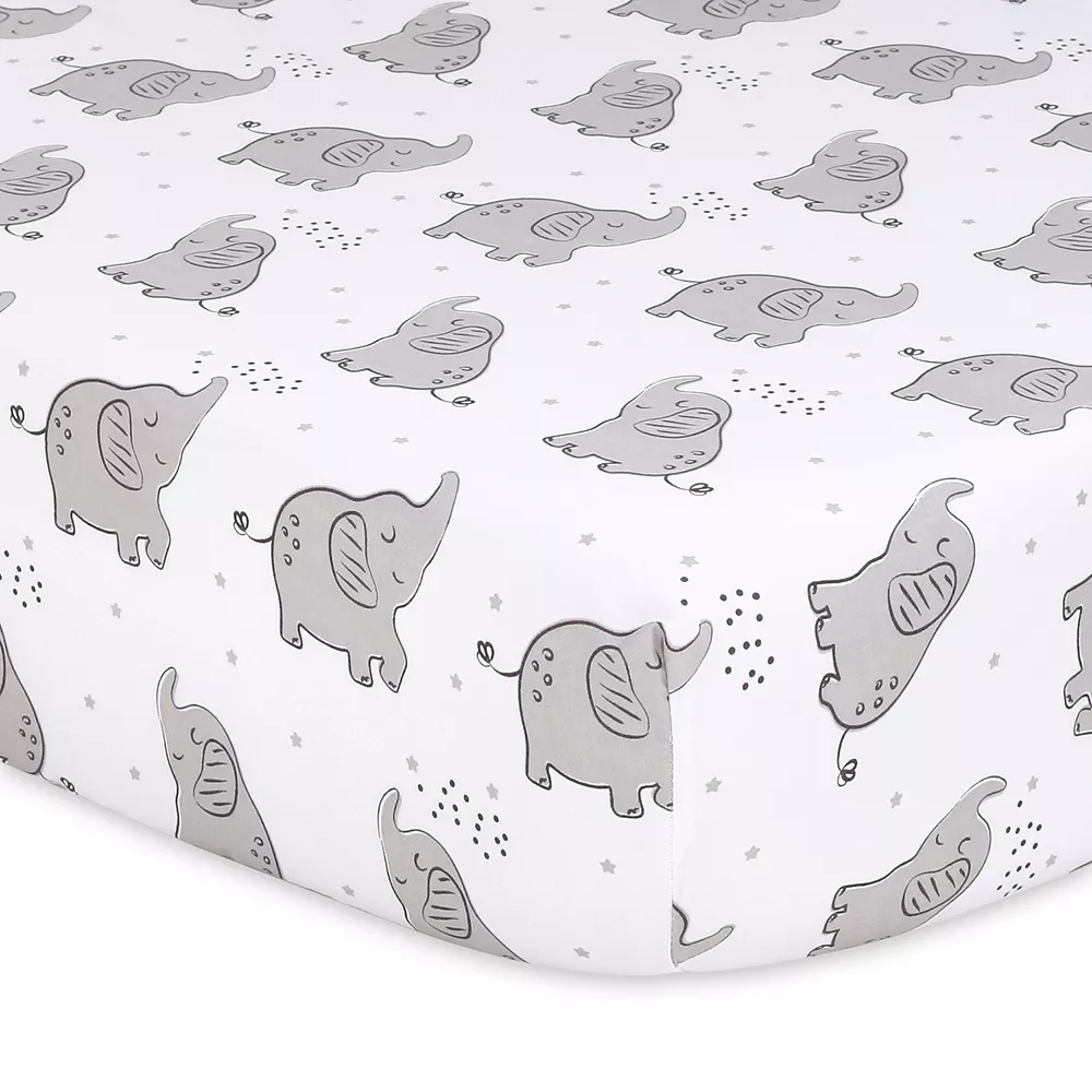 Featuring two printed and two solid crib sheets, your nursery will be stocked in sweet style with these The Peanutshell elephant fitted crib sheets.