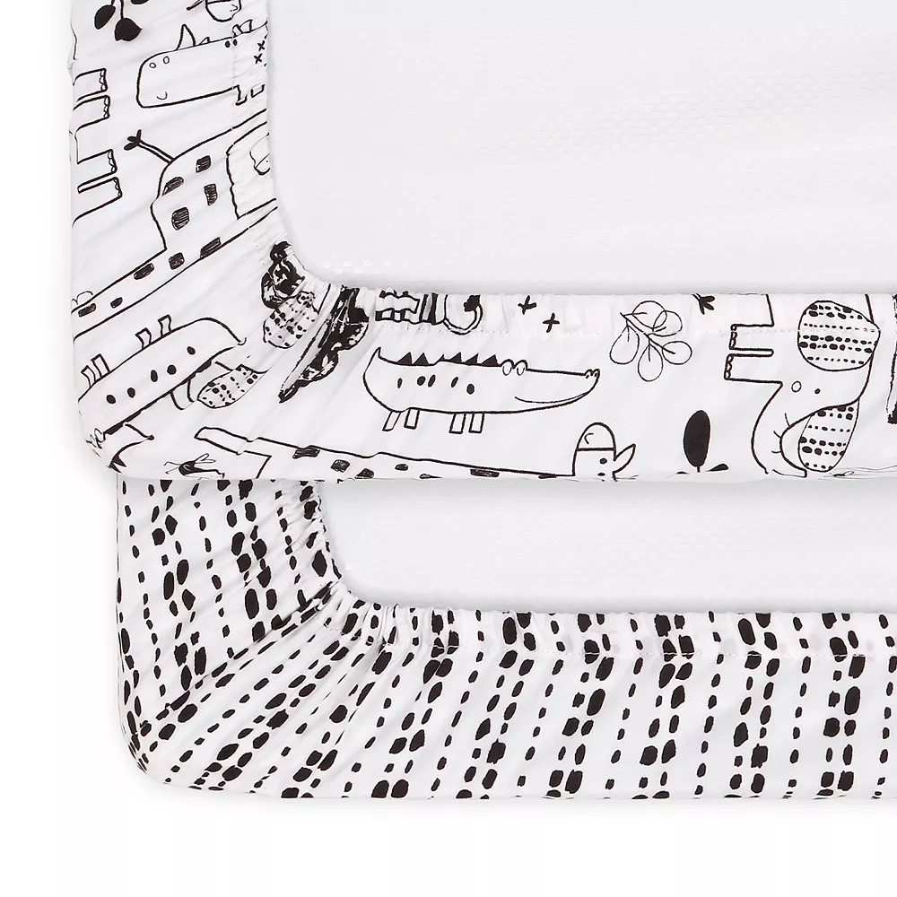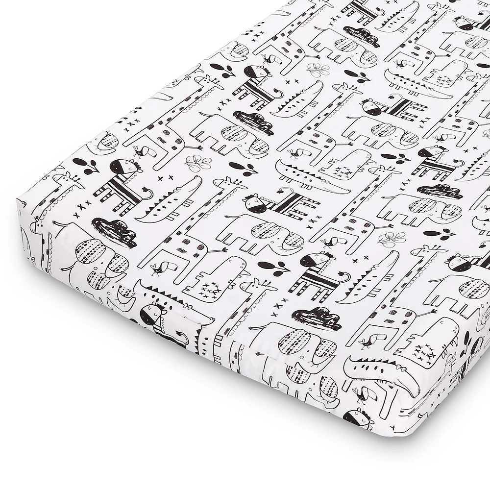 - One pattern is a mix of your little ones favorite animals, including elephants, giraffes, rhinos and alligators in a cute line-drawn print