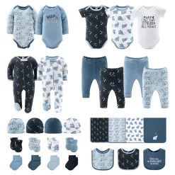 - 30 Piece set includes: 2 long sleeved bodysuits, 3 short sleeved bodysuits, 4 pairs of pants, 4 hats, 4 pairs of scratch mittens, 4 pairs of socks, 4 burp cloths, 2 footed zip-up sleepers, and 3 terry feeding or drool bibs