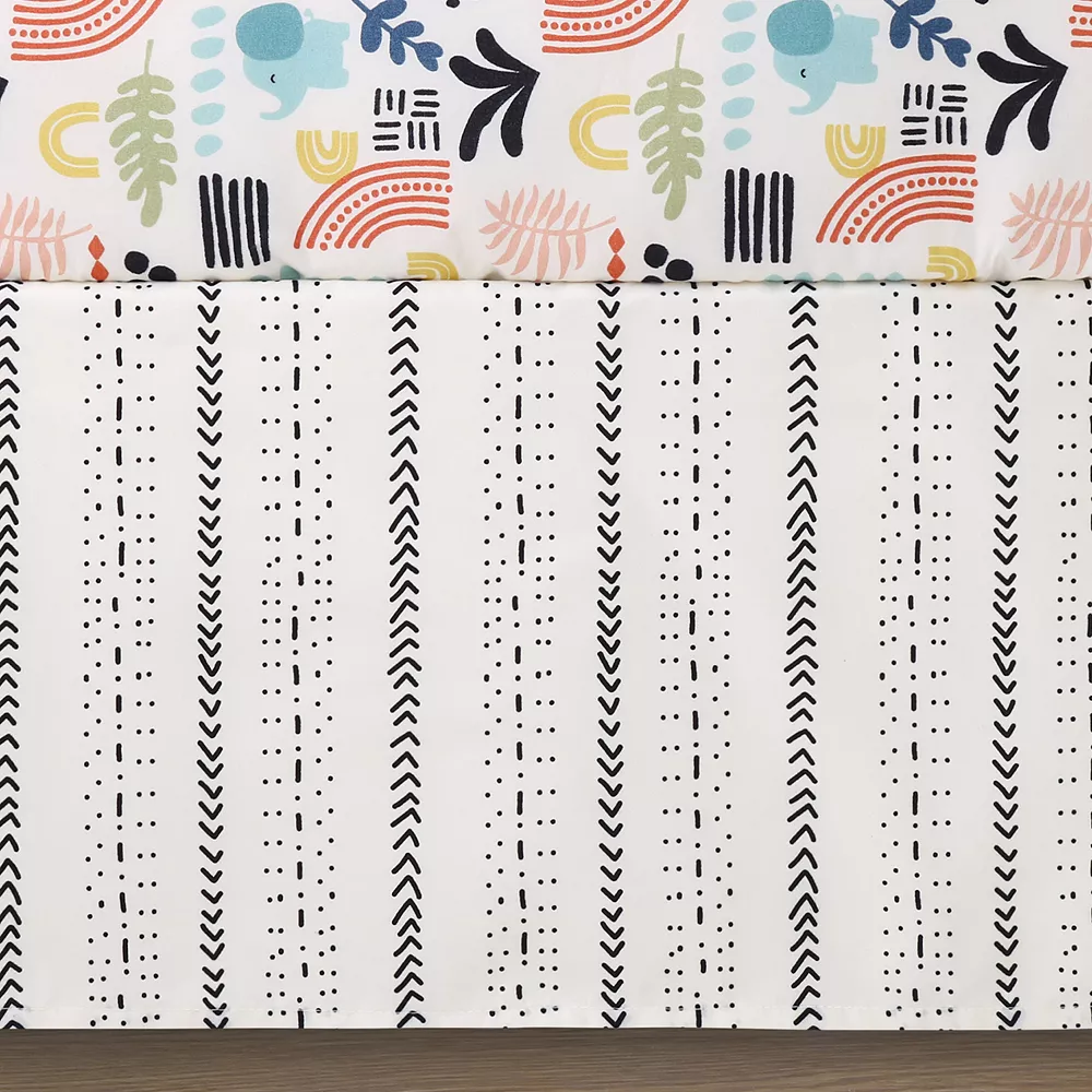 - Fitted sheet matches the center print, while crib skirt echoes the black and white novelty stripe.