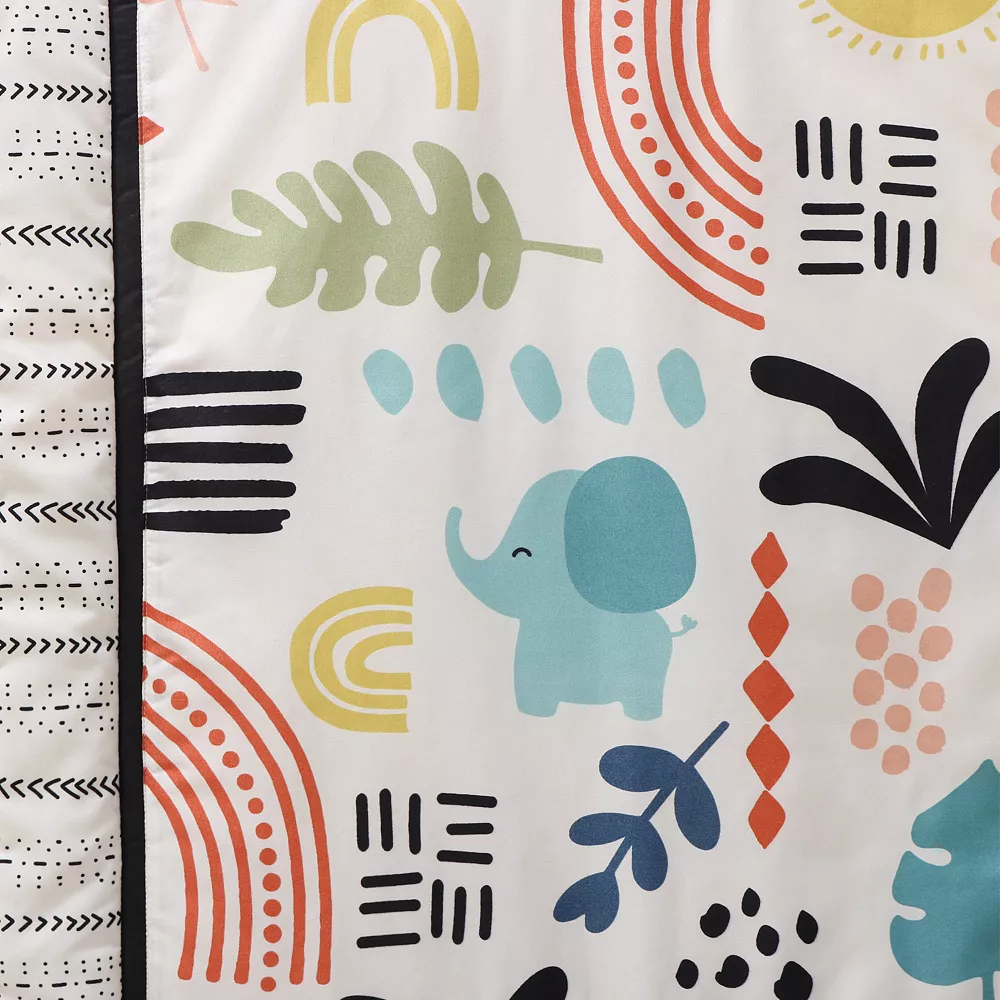 - Quilt features a printed center panel with adorably illustrated jungle motifs, including a happy elephant, shining sun, and colorful leaves, pieced with a large black and white printed border and solid black edge detail.