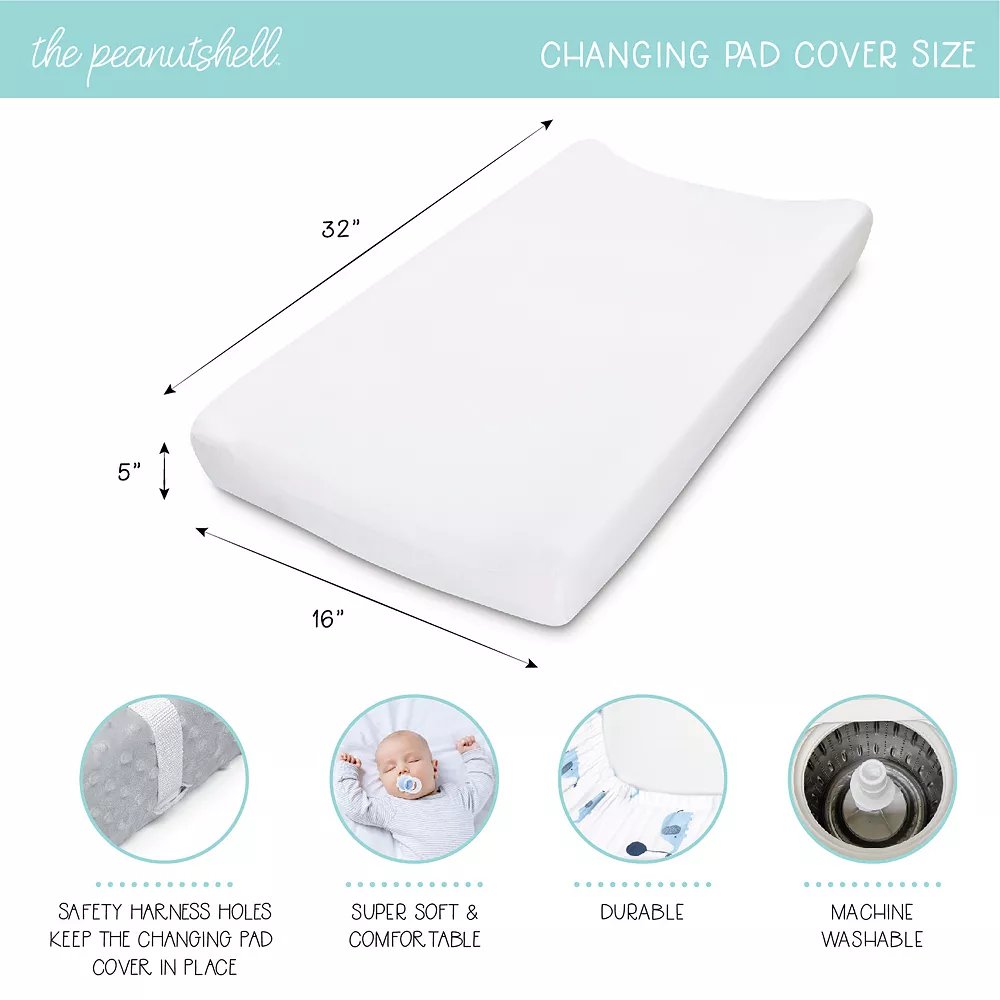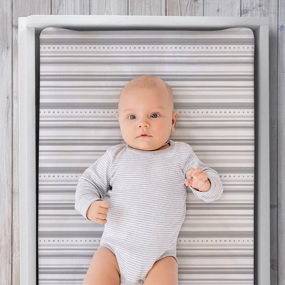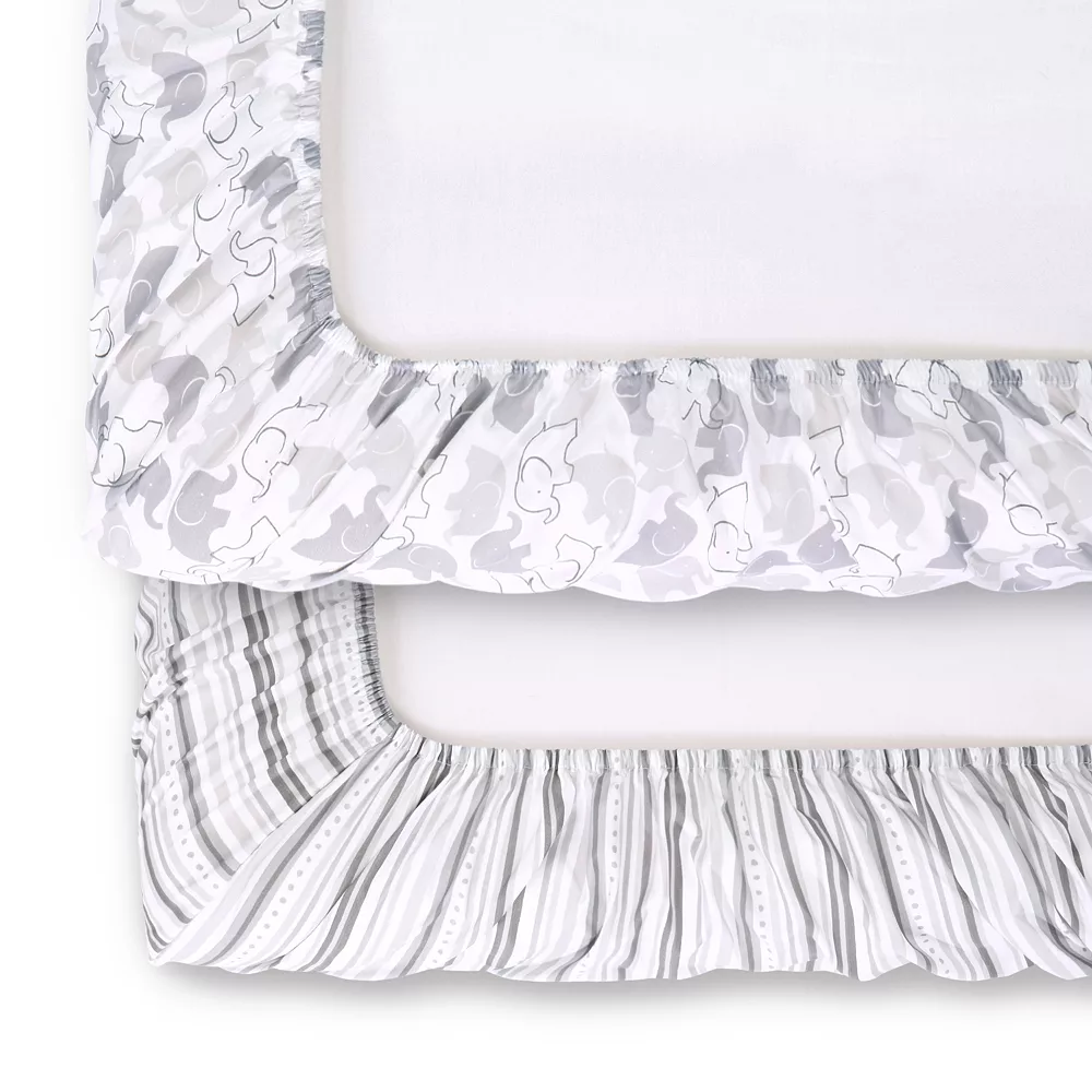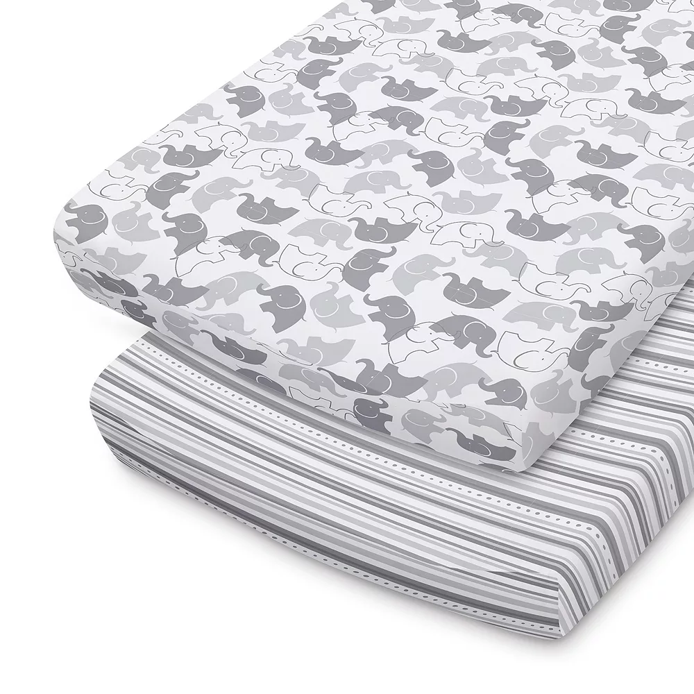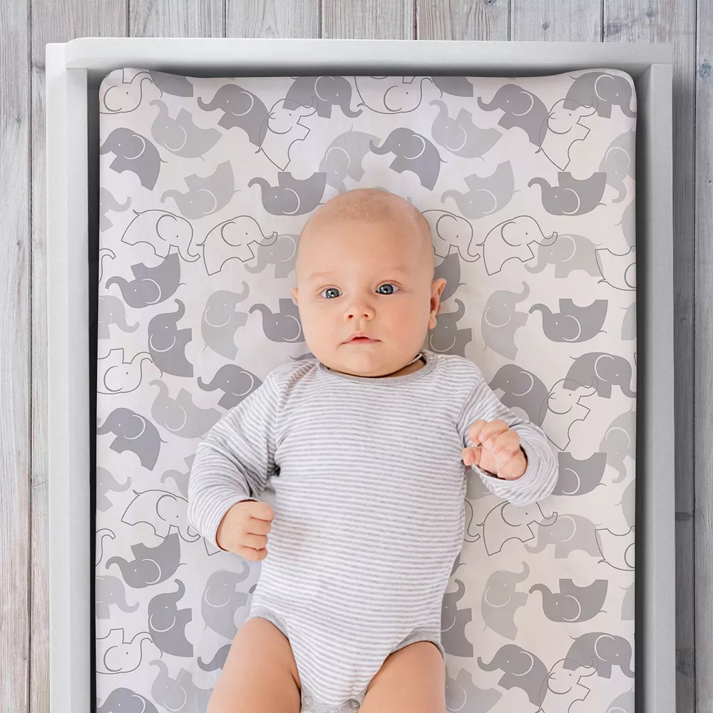 Playful pachyderms tossed in shades of grey on a crisp white ground and a soft painterly stripe in the same colors make up this Grey Elephants 2-pack Changing Pad Cover set from The Peanutshell.