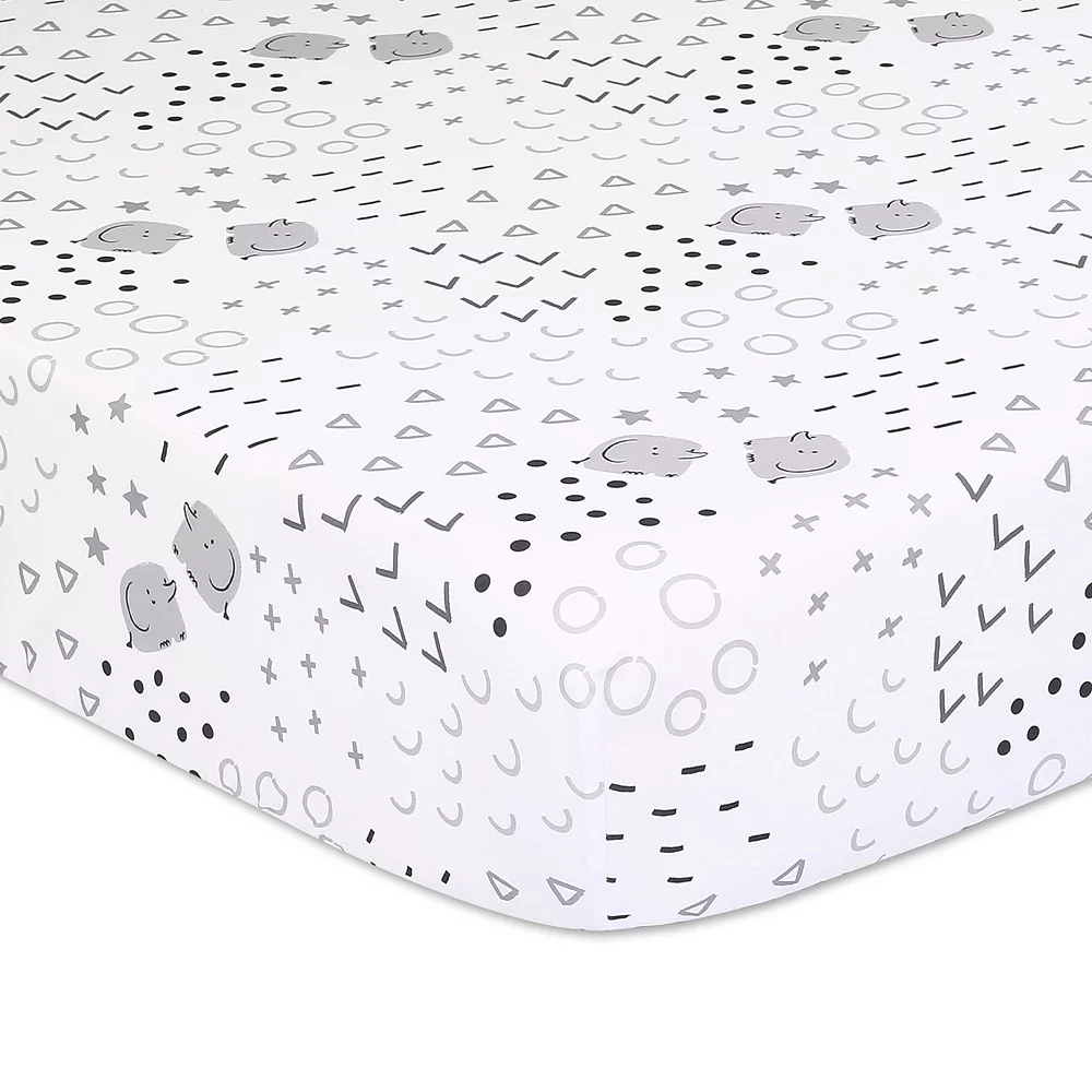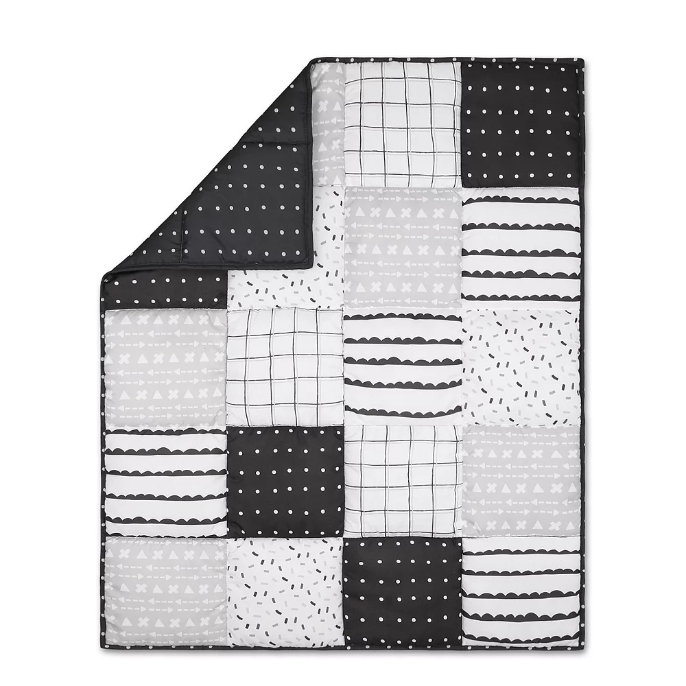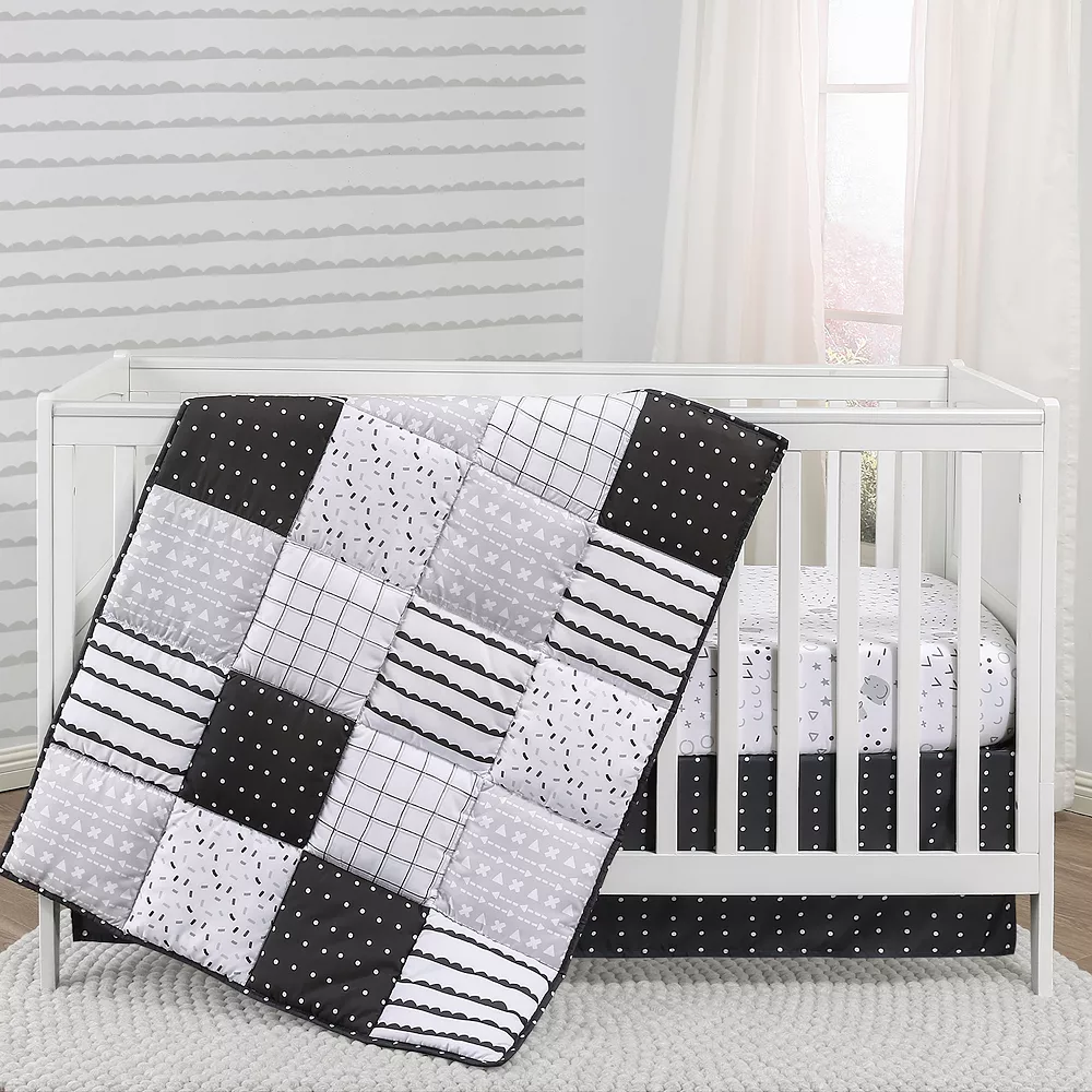 This crib bedding set by The Peanutshell is ideal for a modern nursery with geometrics plus a classic black and white coloring.