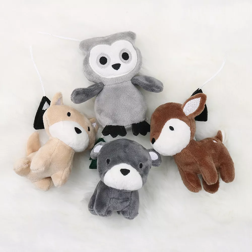- A friendly fox, sweet deer, lumbering bear, and darling owl in shades of grey and tawny brown playfully hang from fabric covered arms and little mountain and tree details