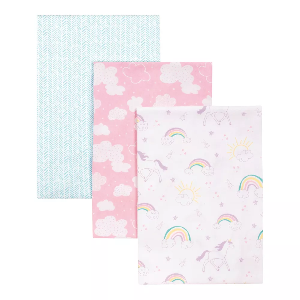 - 3 flannel swaddles with cloud, rainbows and herringbone prints