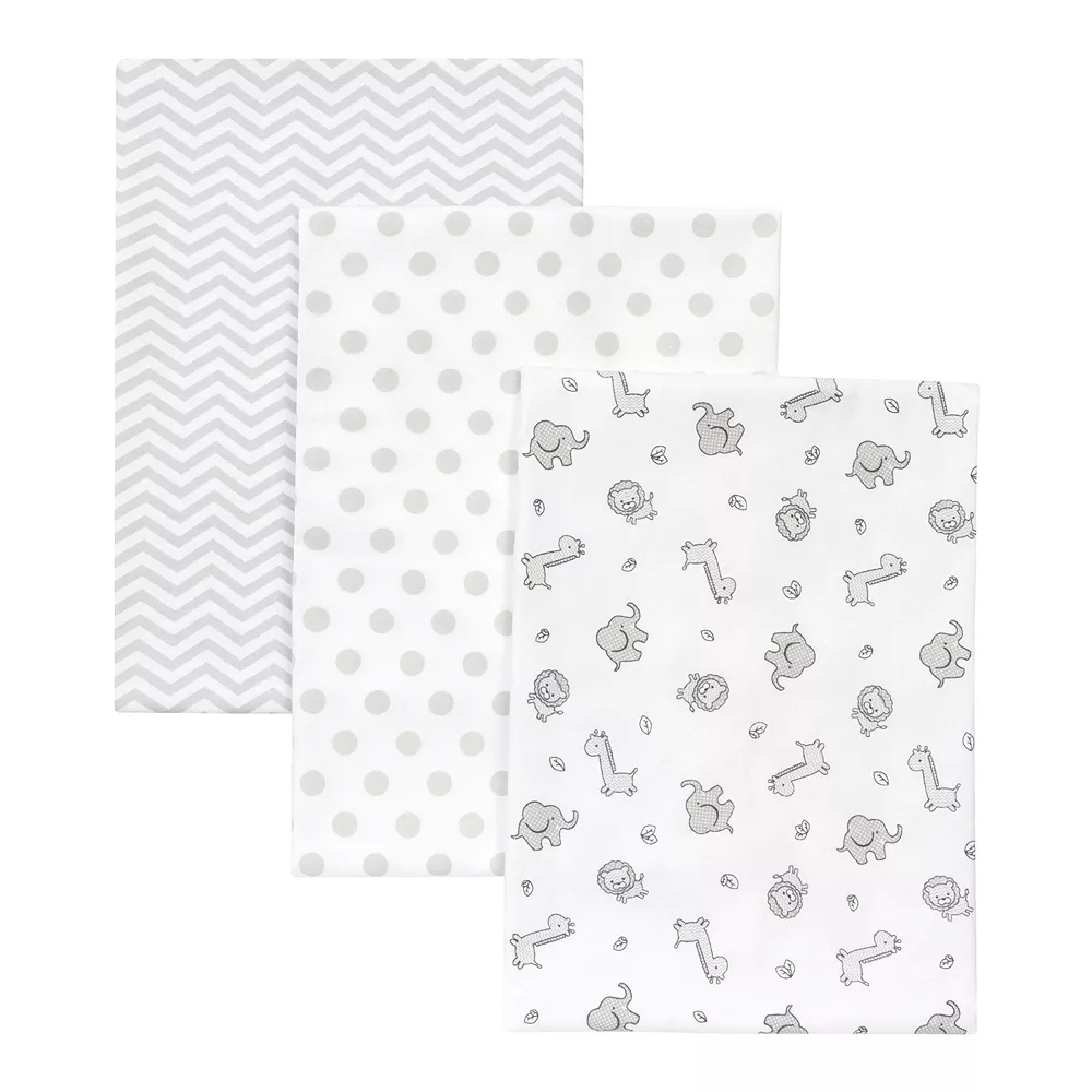 - 3 flannel swaddles with safari critters, polka dots, chevron & elephant graphics