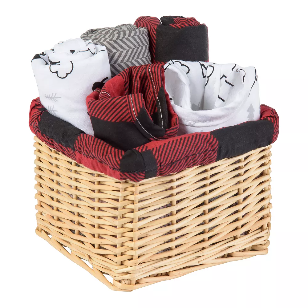 Welcome your little one with this lumberjack moose-themed 7-piece gift basket that features two deluxe bibs, three burp cloths and a reusable basket.