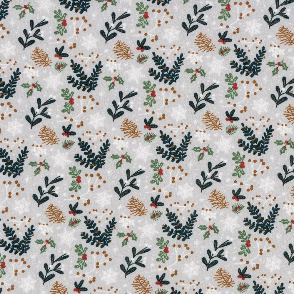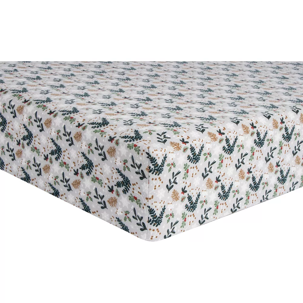 The Mistletoe Deluxe Flannel Fitted Crib Sheet by Trend Lab is 100% brushed cotton and features a festive mistletoe and snowflake scatter print in red, brown, forest green and pine green on a glacier gray background.