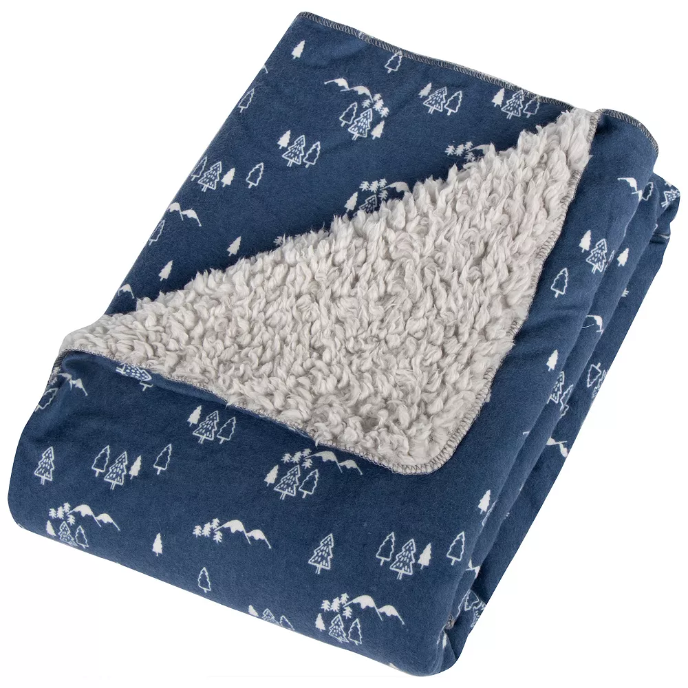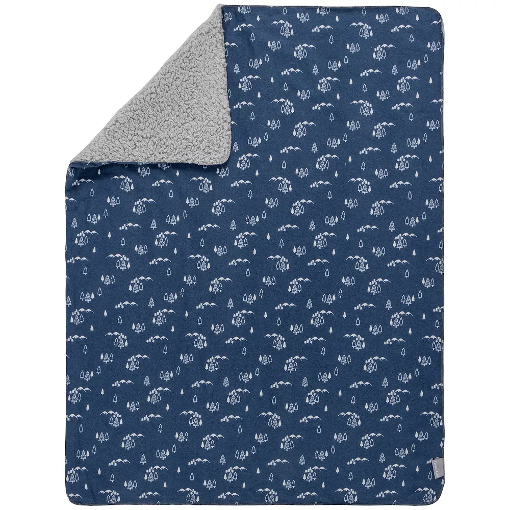 Keep your little one warm and secure with the Mountains Flannel & Faux Shearling Blanket by Trend Lab! White faux shearling is backed with a 100% brushed deluxe cotton flannel featuring a hand-drawn mountain print in white on a navy background.