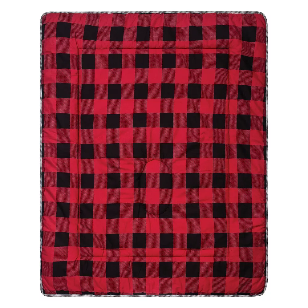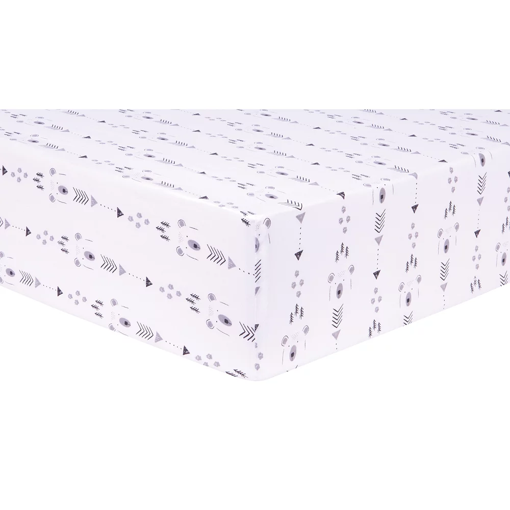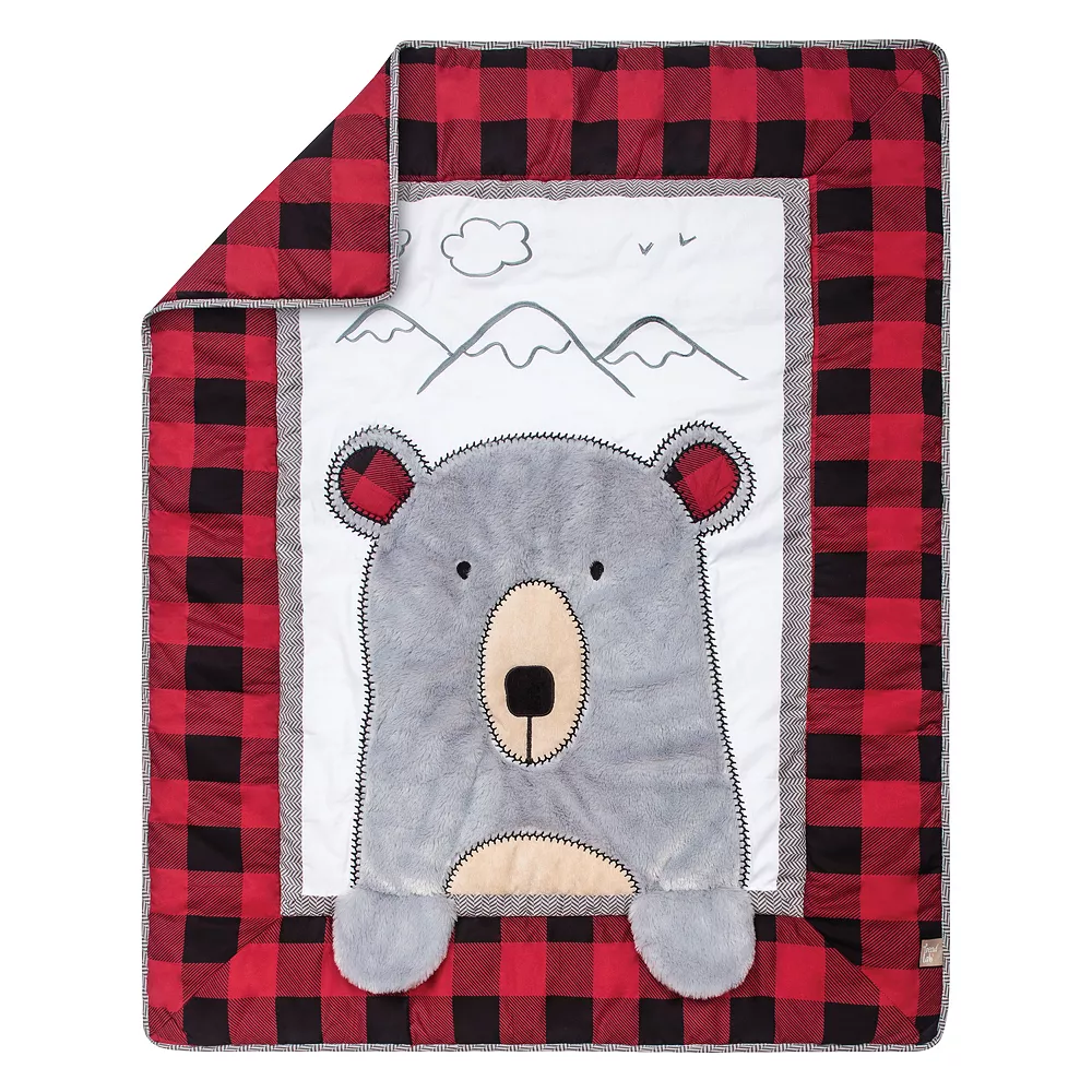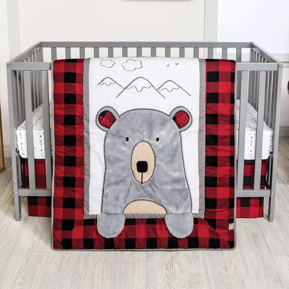 Play Peek-a-Boo with your little one and the adorable Peak-a-Bear Collection by Trend Lab. A soft gray plush bear with a corduroy nose peeks out to the mountains looking for adventure. The bear is framed in printed fabric of gray herringbone and red and black buffalo check for a perfect outdoorsy nursery collection!