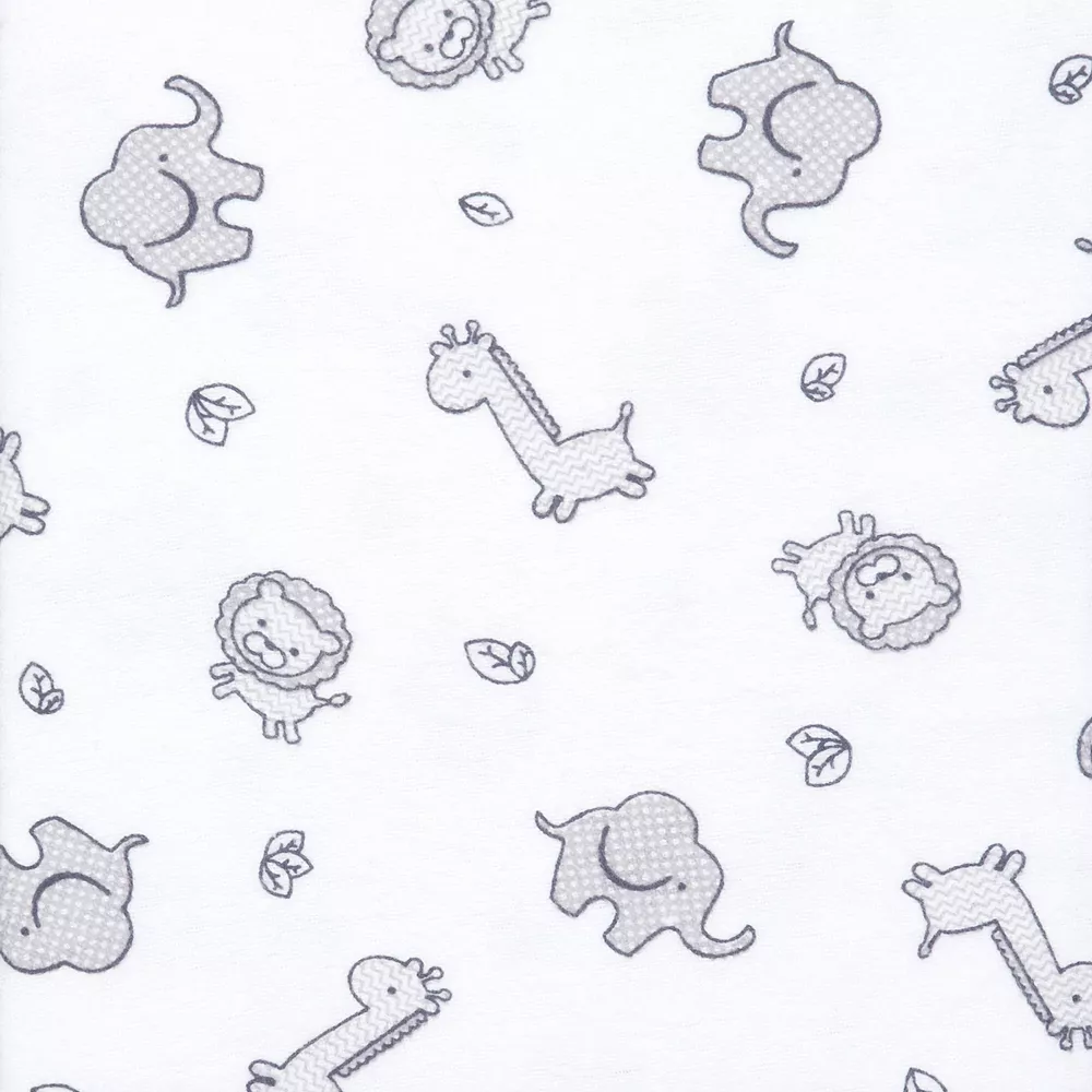 - Scatter print with elephants, giraffes, lions & leaves in grays & white