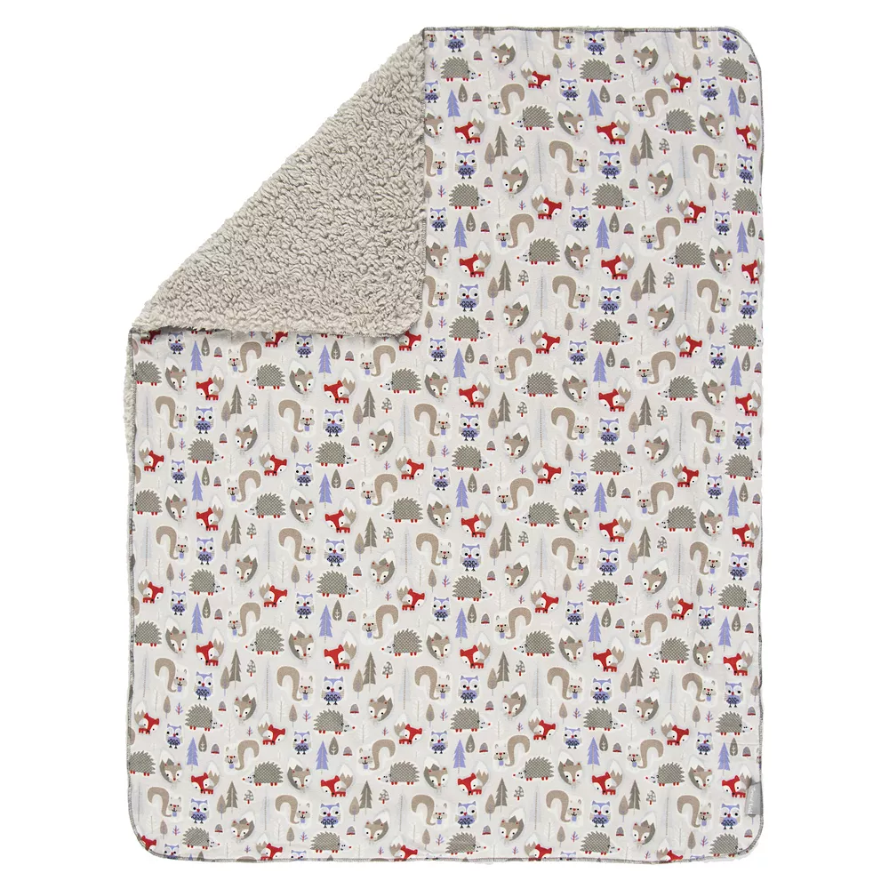 Keep your little one warm and secure with the Winter Forest Flannel & Faux Shearling Blanket by Trend Lab! Dove gray faux shearling is backed with a 100% brushed deluxe cotton flannel featuring cuddly forest animals with woodsy icons in glacier blue, dove gray, periwinkle purple, Icelandic blue, pomegranate red and white.