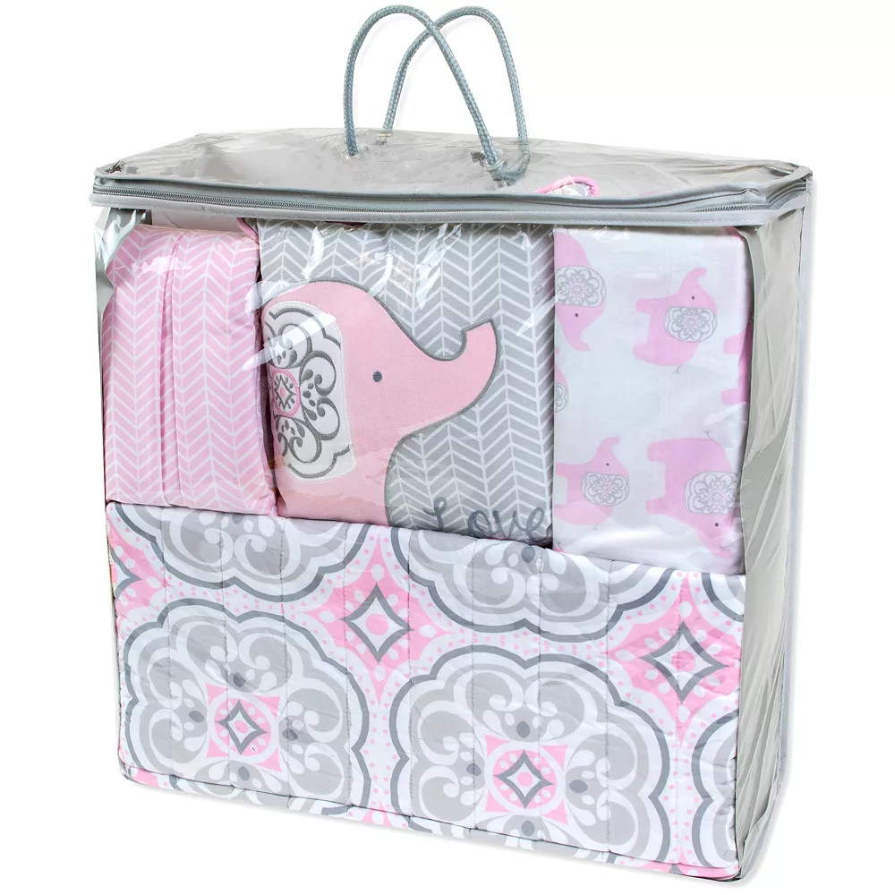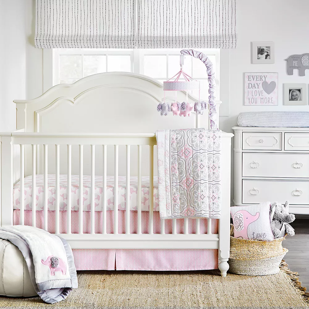 Add a chic touch to baby’s crib with this Wendy Bellissimo Elodie 4-Piece Bedding Set.
